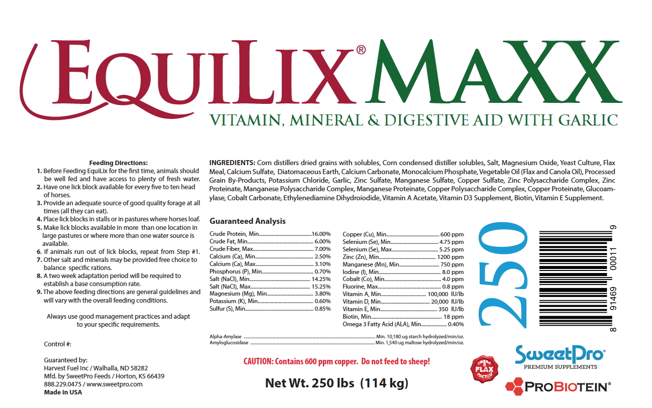 EquiLix® MaXX is SweetPro® Premium Supplement’s all-in-one free choice equine lick block for horses on open range or dry lot situations being fed average to below average hay. Our no molasses/no starch block uses Distiller Dried Grains with solubles (DDGs), Condensed Distiller Solubles (CDS) and flax meal to deliver fiber, fat, protein and complex carbohydrate energy to your horse. EquiLix MaXX also features a complete vitamin, mineral and trace mineral program featuring biotin, vitamin E and organic forms of zinc, copper and manganese.